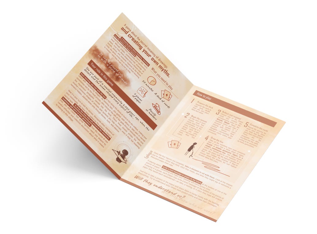 I landed on two guiding ideas: first, the drawings had to echo the style of the Nazca lines; second, they had to reflect the wonder, beliefs, and concerns of the small community the players embodied. Whether you play alone or with a group, each card you draw gives you a spark — a prompt about your community — and your task is to turn that spark into a single, unbroken line on the page. A symbol. A metaphor. A mark that says, we were here.